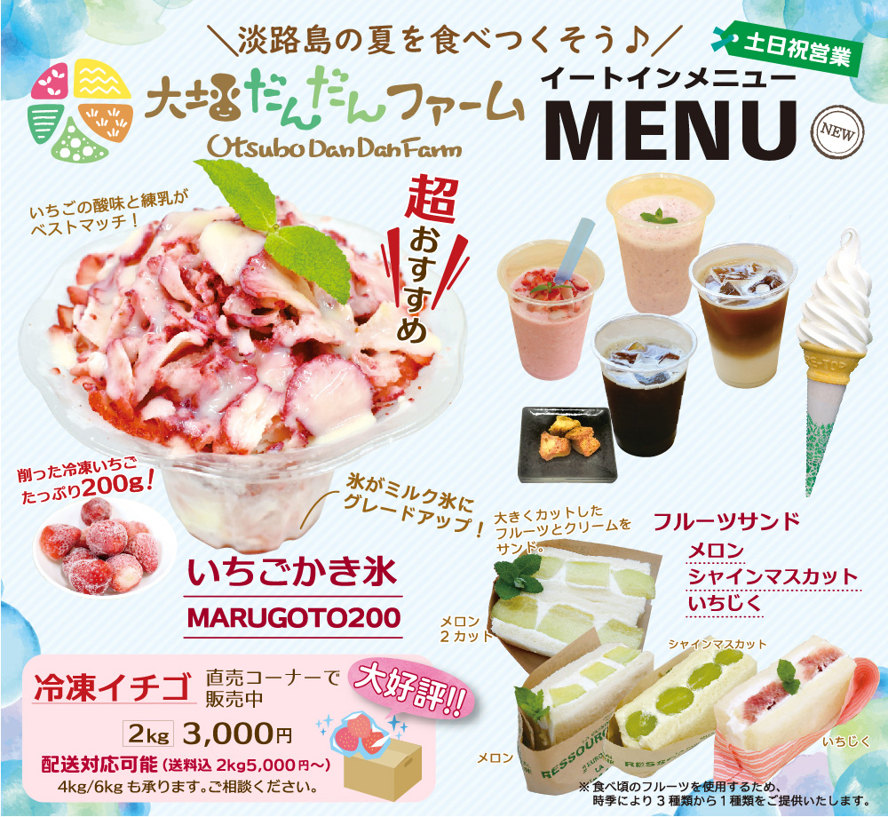 今年の夏も美味しいがいっぱい!! 今年の大坪だんだんファームも、夏限定メニューが目白押し! 毎年大好評の「いちごかき氷 -marugoto200-」、はスライスした冷凍イチゴがたっぷり!! ...
